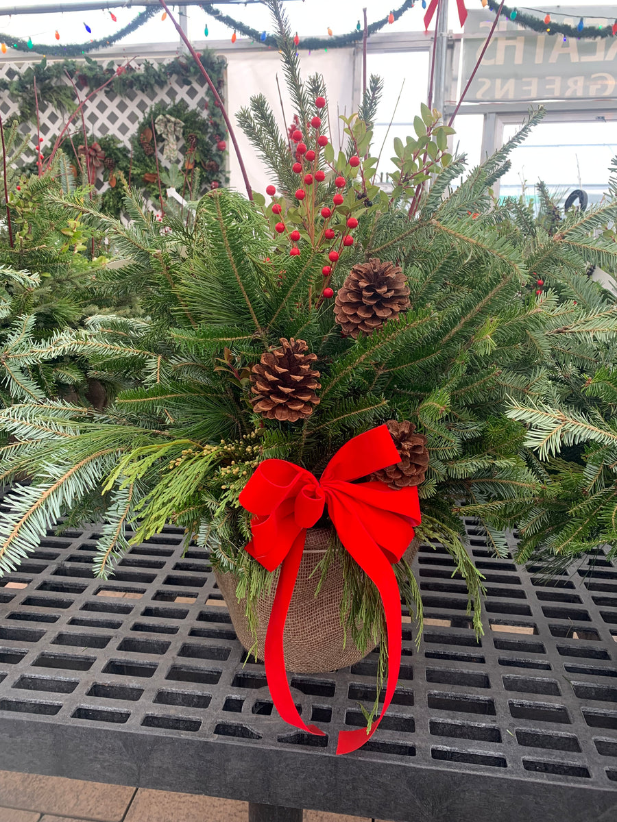 12" Burlap Planter OR 12" Black Fancy Planter with assorted fresh greens, one bow, 3 pinecones and 3 decorative branches.