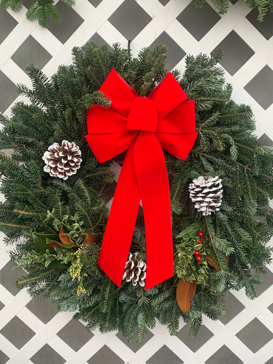 diameter) , one bow of your choice, three pinecones, and additional fresh greenery and accents to make your own unique wreath.